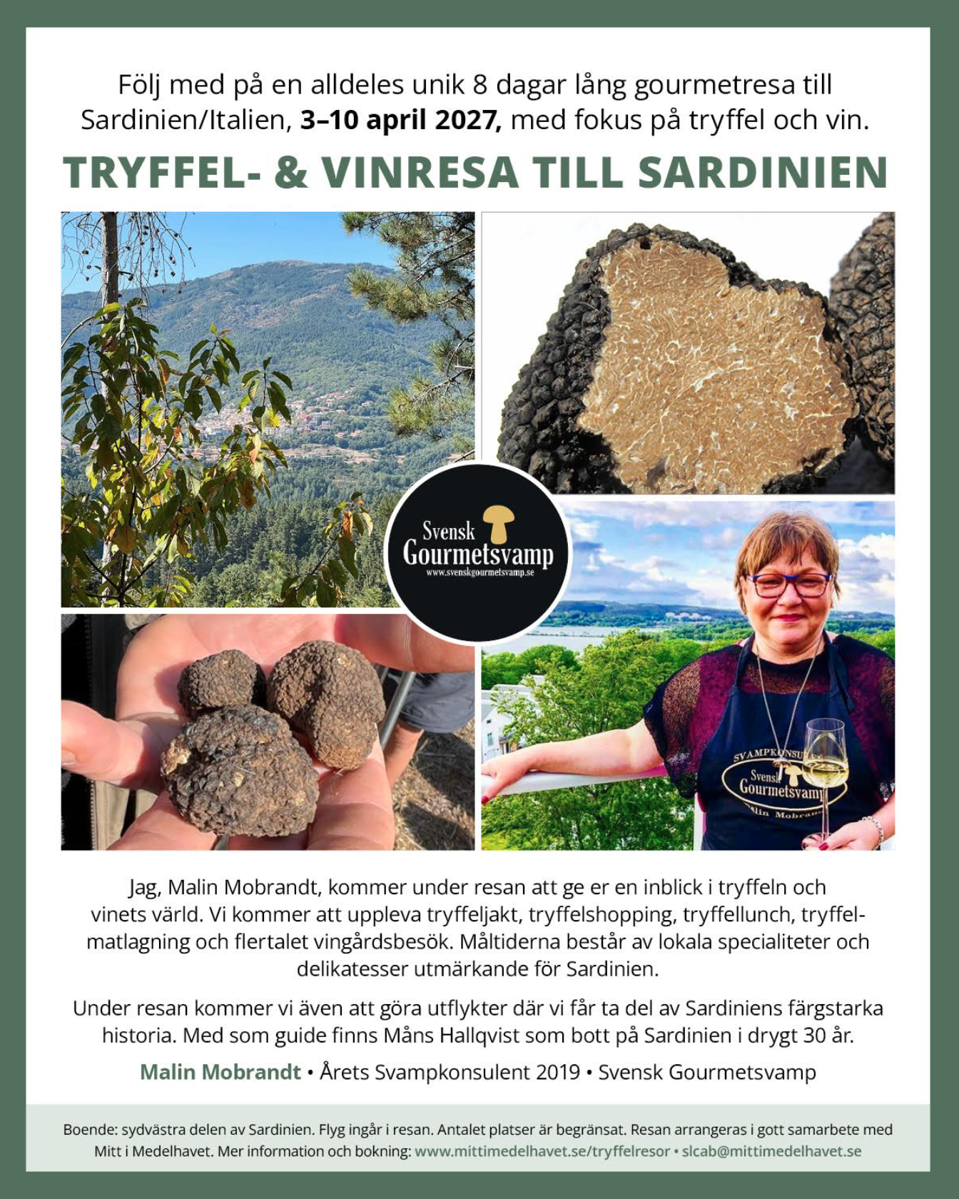 Det blir en tryffel och vinresa på denna magiska ö, min nionde resa till ön mitt i medelhavet tillsammans med Måns från företaget Mitt i medelhavet. På denna resa kommer det lagas mat med svamp från Sverige, deltagargänget kommer få göra ett svampquiz med lyxiga vinster från Sverige samt få en lyxig Goodiebag med produkter från Sverige. Jag hoppas...
